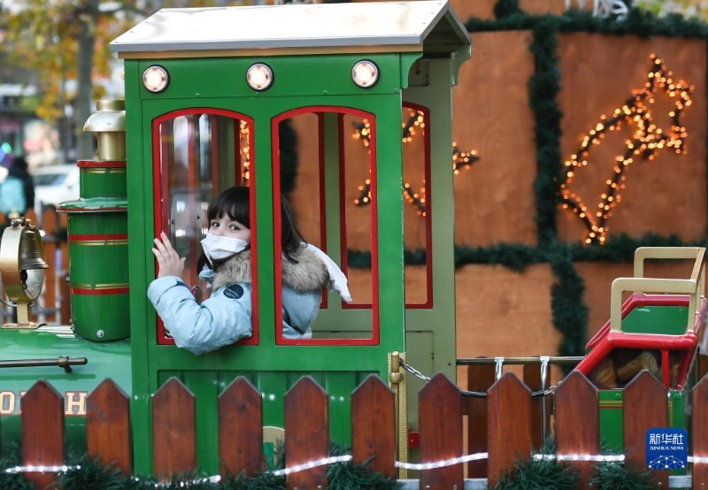 11月22日,在德國法蘭克福圣誕市場,戴口罩的游客乘坐“迷你火車”?! ?/p>