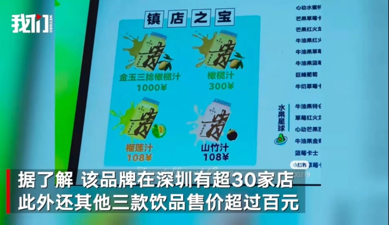 ▲深圳某飲品店一款名為“金玉三捻橄欖汁”的飲品標(biāo)價(jià)1000元,另有三款飲品標(biāo)價(jià)超過(guò)100元。圖/新京報(bào)我們視頻截圖