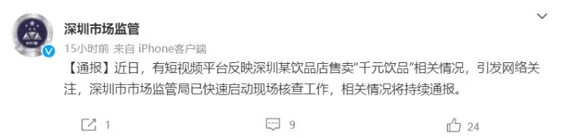 ▲11月22日,深圳市監(jiān)局回應(yīng)“千元飲品”相關(guān)情況,稱“已啟動(dòng)現(xiàn)場(chǎng)核查”。圖/深圳市場(chǎng)監(jiān)管官方微博截圖