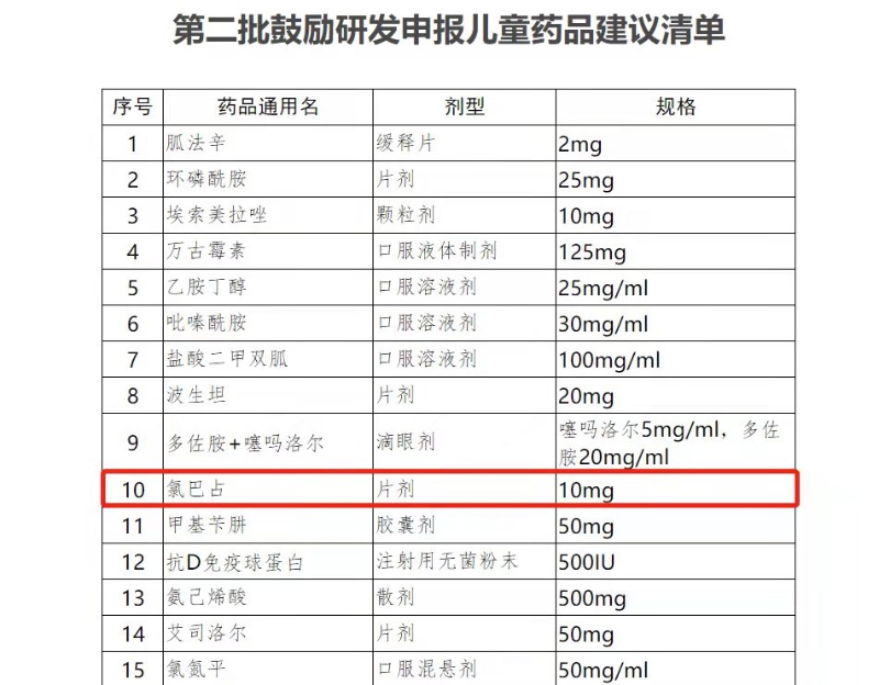 ▲2017年5月12日,國(guó)家衛(wèi)生健康委員會(huì)發(fā)布《關(guān)于第二批鼓勵(lì)研發(fā)申報(bào)兒童藥品建議清單的公示》,清單中第10項(xiàng)為規(guī)格10mg的“氯巴占 ”。圖/國(guó)家衛(wèi)生健康委員會(huì)官網(wǎng)截圖