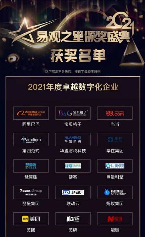 10月28日晚,“數(shù)字之光”2021易觀之星頒獎盛典圓滿落下帷幕。頒獎典禮上各式獎項集中綻放,100家企業(yè)、品牌經(jīng)過激烈的競爭和角逐,脫穎而出,評選出“2021年度卓越數(shù)字化企業(yè)”、“2021年度卓越數(shù)字應(yīng)用”、“2021年度新銳數(shù)字應(yīng)用” “2021年度用戶推薦數(shù)字應(yīng)用”四大榮譽稱號。其中當當網(wǎng)、阿里巴巴、美團等互聯(lián)網(wǎng)大廠紛紛上榜年度卓越數(shù)字化企業(yè)。