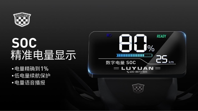 具體來說,SOC是一種電量顯示方式,它通過“實時積分”與“放電修正”雙重電量算法,來計算電量。搭載了SOC精準電量顯示技術的綠源INNO5,直接以“百分比”的形式精準顯示電量,電量精準度≥95%,電量精確到1%。在電動車電量不足時,綠源SOC精準電量顯示還可以通過“智能語音”和“智能提醒”功能,實時播報電池精準電量,提醒你及時充電,有效避免了電池過度放電的情況,同時也有利于延長電池使用壽命。