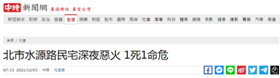 【環(huán)球網(wǎng)報道】據(jù)臺灣“中時新聞網(wǎng)”消息,臺北市水源路今天(3日)凌晨發(fā)生一起火災(zāi),一棟12層住宅在10樓處傳出警鈴聲響和煙味,消防員獲報后立即趕往現(xiàn)場撲救,并在起火戶內(nèi)發(fā)現(xiàn)兩名“失去生命跡象”(無生命特征)者,緊急送醫(yī)搶救后已有1人死亡。