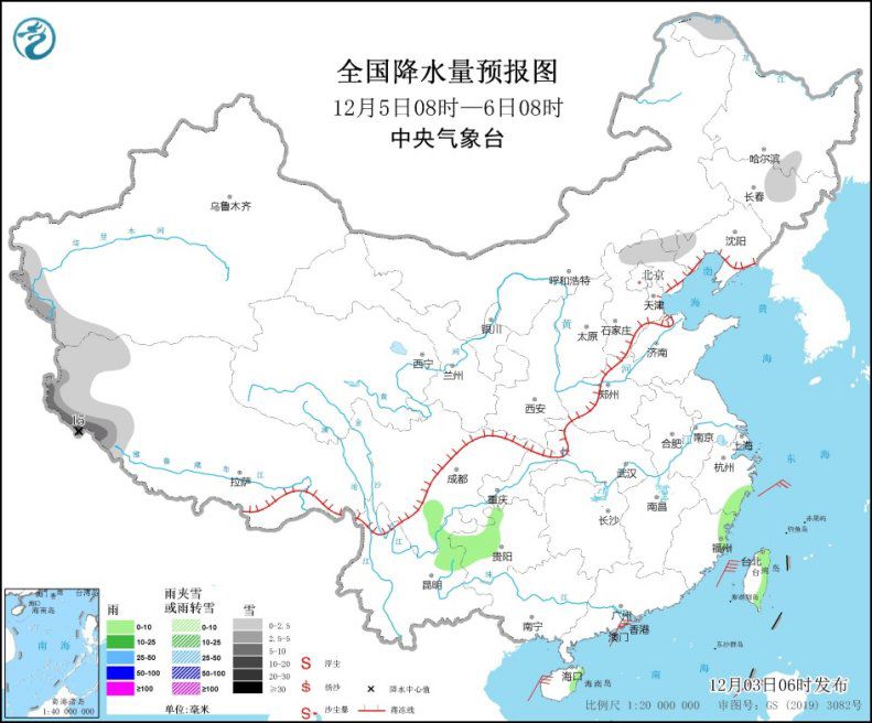 12月5日08時至6日08時,西藏西部、河北北部等地部分地區(qū)有小到中雪,其中,西藏西部等地部分地區(qū)有大到暴雪(10~15毫米)。浙江中南部、福建東北部、四川南部、貴州中西部、云南東北部、海南島東北部、臺灣島北部和東部等地部分地區(qū)有小雨。我國東南部海區(qū)有有6~7級東北風(fēng)。