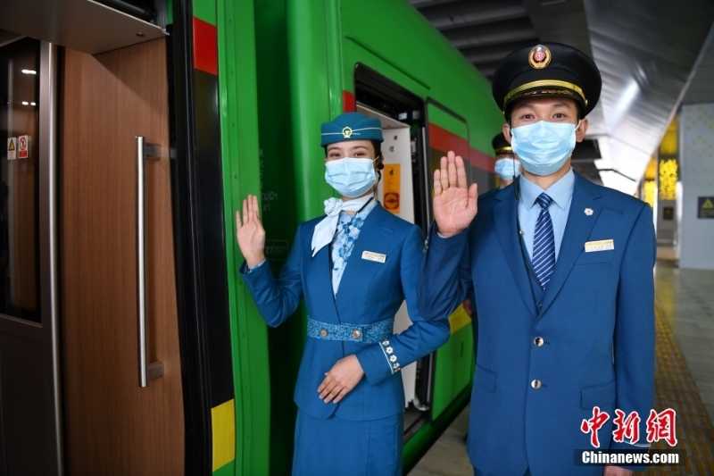 12月3日16時(shí)45分,載著700多名乘客的C3次動(dòng)車“復(fù)興號(hào)”緩緩駛出昆明火車站,標(biāo)志著連接中國昆明和老撾首都萬象、全線采用中國標(biāo)準(zhǔn)的中老鐵路全線開通運(yùn)營,老撾自此邁入鐵路運(yùn)輸時(shí)代,也為構(gòu)建中老命運(yùn)共同體提供了有力支撐。圖為列車員迎接首批旅客。 中新社記者 劉冉陽 攝