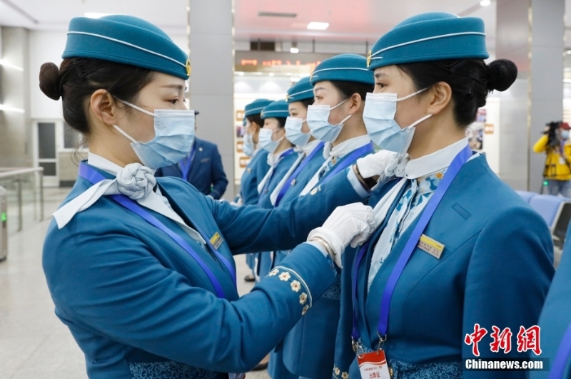 圖為列車員迎接首批旅客。 中新社記者 劉冉陽 攝