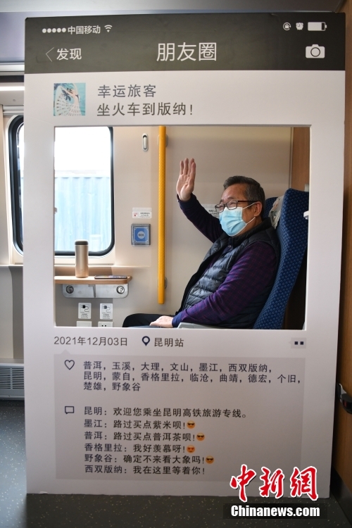 圖為旅客在列車上與“朋友圈”裝飾合影。 中新社記者 劉冉陽 攝