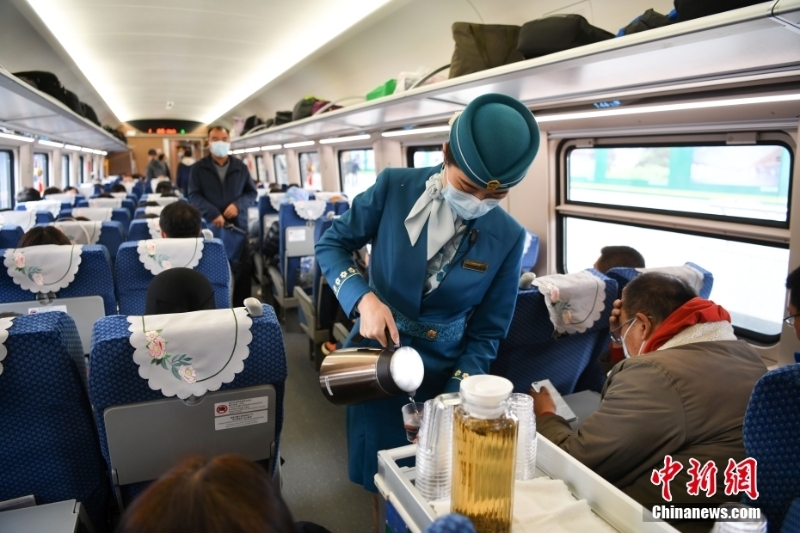 圖為列車員為旅客提供服務(wù)。 中新社記者 劉冉陽 攝