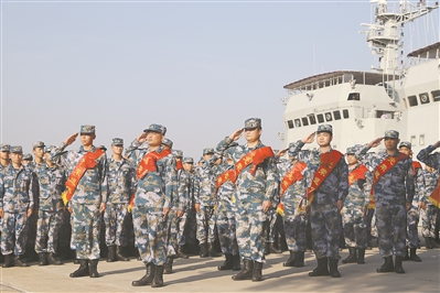11月30日,南部戰(zhàn)區(qū)海軍某大隊(duì)舉行退役儀式,退役士兵身披綬帶、胸戴紅花向軍旗告別。龔 勛攝