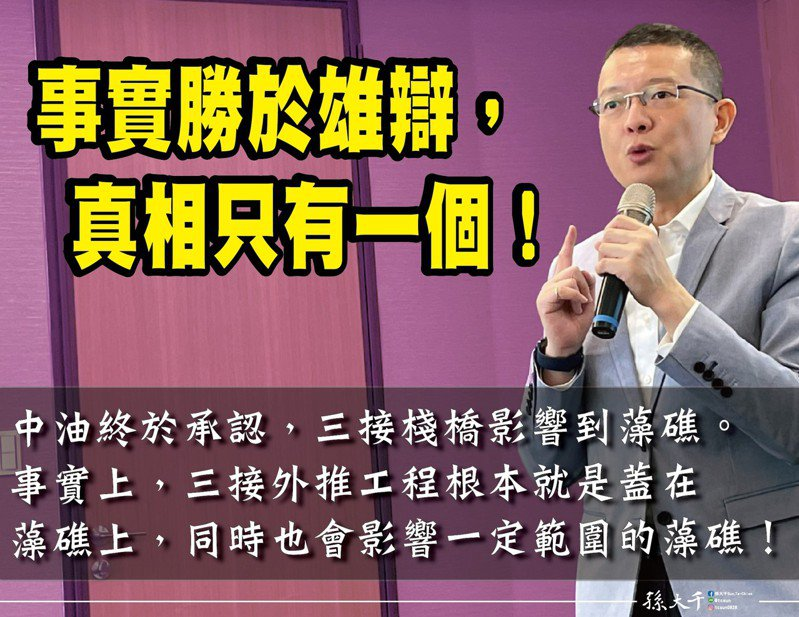 前“立委”孫大千在社交平臺表示,事實勝于雄辯,真相只有一個,臺“中油”終于承認(rèn),三接棧橋影響到藻礁。圖/取自孫大千社交賬號