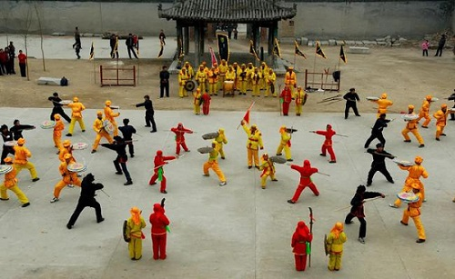 實(shí)戰(zhàn)時藤牌陣法變化多樣,常見的有一字長蛇陣、八卦連環(huán)陣、梅花五方陣、四門迷魂陣、八門穿心陣等,陣容可隨實(shí)戰(zhàn)需要擴(kuò)大到成千上萬人。藤牌陣在對打競技或集會表演時,有鼓樂伴奏。其器具有戰(zhàn)鼓、大鑼、大鐃、镲等輔助,鼓法有進(jìn)軍鼓、退卻鼓、變陣鼓、得勝鼓等十多種。