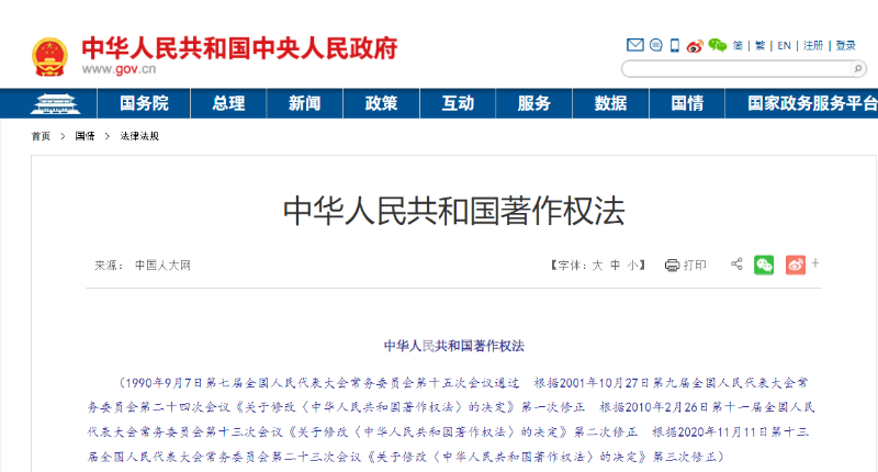▲最新修訂版《著作權(quán)法》于今年6月1日起施行。圖/國務(wù)院官網(wǎng)截圖