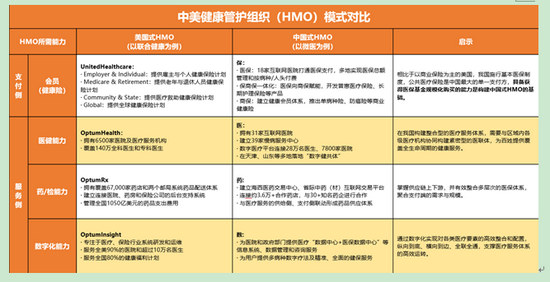 值得一提的是,1973年為了遏制快速增長的醫(yī)療支出,美國推出《健康維護組織法》,鼓勵健康維護組織 (HMO) 的快速發(fā)展,在此背景下全球知名健康管護組織——聯(lián)合健康應運而生。盡管中美醫(yī)療體制大相徑庭,但通過構建健康管護體系,加強對醫(yī)院、醫(yī)生等各方的有效管控以及對患者的健康維護,實現(xiàn)整個健康服務體系降本增效的內(nèi)核是相通的。從這個意義講,“聯(lián)合健康”的模式對于構建“以健康為中心”的健康維護體系具有重要參考意義。