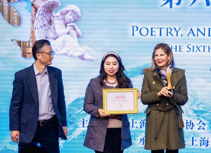 開幕式上,上海市人民對外友好協(xié)會會長陳靖,上海市作家協(xié)會黨組書記、專職副主席王偉,中共上海市徐匯區(qū)委常委、宣傳部部長趙懿分別致辭。上海市作家協(xié)會副主席、上海國際詩歌節(jié)藝術(shù)委員會主席趙麗宏宣布獲獎詩人名單及頒獎詞。陳靖會長和趙懿部長為馬加里托?奎亞爾頒發(fā)“金玉蘭”獎杯。由于疫情原因,馬加里托?奎亞爾先生沒有親臨現(xiàn)場,由墨西哥駐滬總領(lǐng)事代領(lǐng)獎?,F(xiàn)場播放了馬加里托?奎亞爾獲獎感言的視頻,著名配音演員、主持人劉家禎與墨西哥駐滬總領(lǐng)事Lorena Larios(柳若蘭)女士共同朗誦了馬加里托?奎亞爾的詩《羚羊和絲綢之路》。