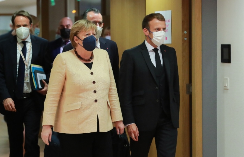 10月21日,在位于比利時布魯塞爾的歐盟總部,法國總統(tǒng)馬克龍(右)與德國總理默克爾出席歐盟峰會。(新華社發(fā),歐盟供圖)