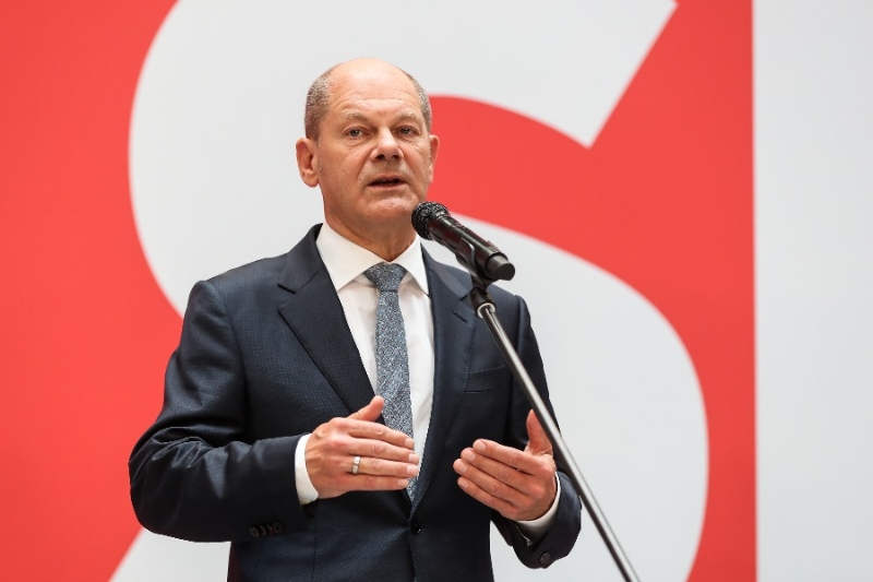 9月27日,在德國首都柏林的社民黨總部,社民黨總理候選人朔爾茨出席新聞發(fā)布會。(新華社記者單宇琦攝)
