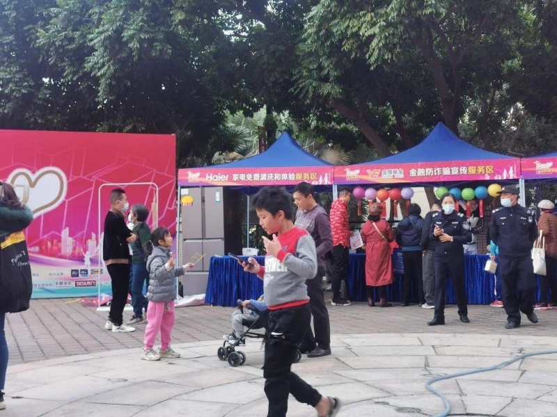 在活動現(xiàn)場,記者看到,主辦方設(shè)有簽到及禮品兌換區(qū)、宜家家居的綠色環(huán)保健康生活互動區(qū)、多樂士的墻體墻面檢測服務(wù)區(qū)、東鵬瓷磚的衛(wèi)浴及瓷磚維修服務(wù)區(qū)、TATA木門的門窗及鎖具維修服務(wù)區(qū)、海爾的家電免費清洗和體驗服務(wù)區(qū)、金鷹基金的金融防詐騙宣傳服務(wù)區(qū)、番禺供電局服務(wù)區(qū)這八大服務(wù)區(qū),有許多居民前來咨詢或預(yù)約上門服務(wù)。