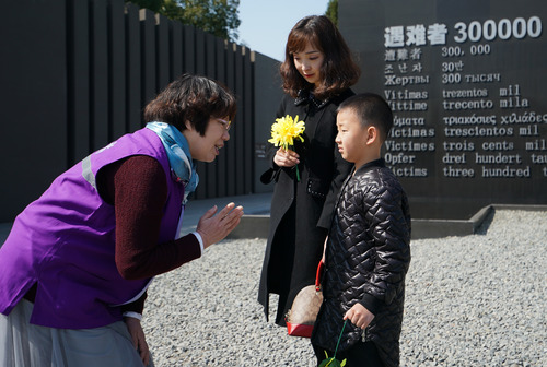來(lái)自日本的黑田薰是紀(jì)念館的第一位國(guó)際志愿者。1997年,她第一次參觀紀(jì)念館,看著眼前的森森白骨,她開(kāi)始盡己所能將真相傳播給日本民眾,并在2008年戴上“紫金草”的徽章,成為一名國(guó)際志愿者。