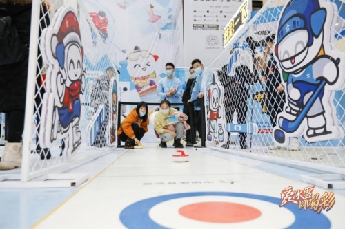在筑夢冰雪區(qū)域,VR科技+冰雪互動打造的趣味游戲讓現(xiàn)場觀眾樂此不疲。VR滑雪游戲利用虛擬現(xiàn)實技術(shù)與冰雪運動項目深度融合,科技感滿滿,使參與者可沉浸體驗在雪地馳騁的快樂。除此之外,冰壺體驗游戲前也排起了長隊,現(xiàn)場觀眾手握球把,奮力將冰壺球滑向圓心得分區(qū),頗有專業(yè)風(fēng)范。多種好玩刺激的冰雪互動游戲讓活動現(xiàn)場人氣高漲。