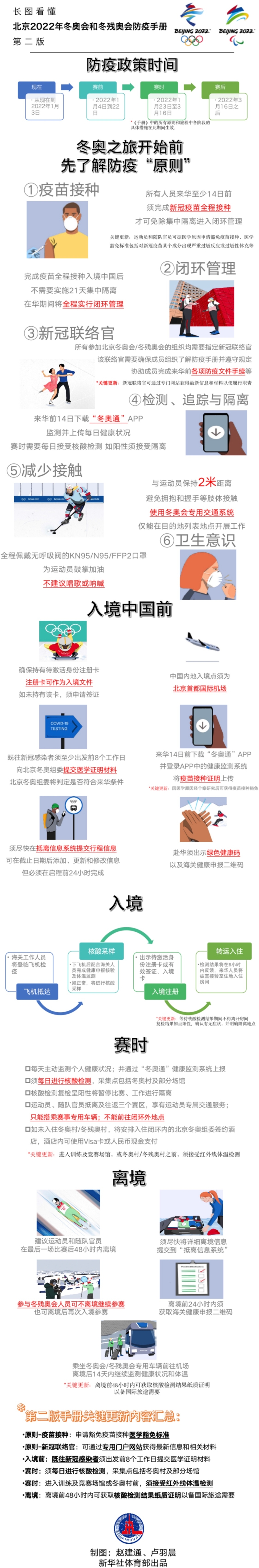第二版《防疫手冊》對第一版手冊進行了補充,在疫苗接種、海關入境要求、機票預訂、出發(fā)前檢測、冬奧賽時、閉環(huán)管理等方面,提供了更加詳實的信息。手冊還包括“注意事項”部分,有助于指導利益相關方順利度過賽事期間的每個階段。