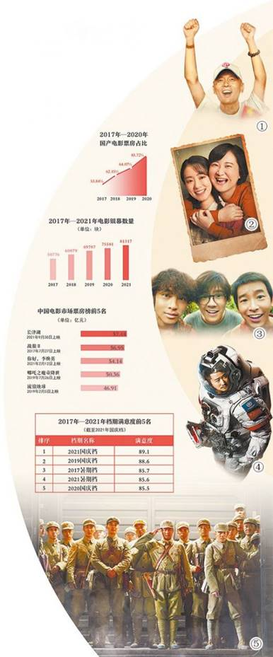 由國(guó)家電影局、中國(guó)電影藝術(shù)研究中心提供數(shù)據(jù)顯示,截至12月8日,2021年中國(guó)電影總票房和銀幕數(shù)量穩(wěn)居世界首位,全國(guó)銀幕數(shù)達(dá)81317塊,巨型銀幕規(guī)模位居世界第一。過(guò)去5年,中國(guó)電影生產(chǎn)總量超過(guò)4000部,觀影人次超過(guò)80億。