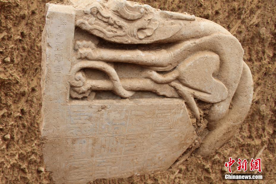 豆盧恩碑首出土現(xiàn)場。陜西省考古研究院供圖(來源:中新網(wǎng))