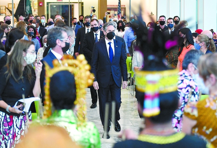 14日,正在印尼訪問的美國務卿布林肯到美國駐雅加達大使館參加活動。