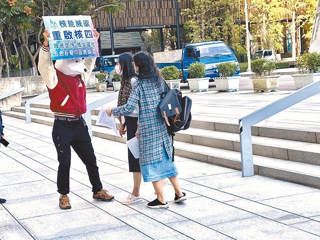 圖為環(huán)團14日在臺中市議會廣場為“藻礁投同意”催票時,一名頭戴北極熊頭套的民眾,手持“核能減碳、重啟核四”,與環(huán)團一度發(fā)生爭議。(盧金足攝)