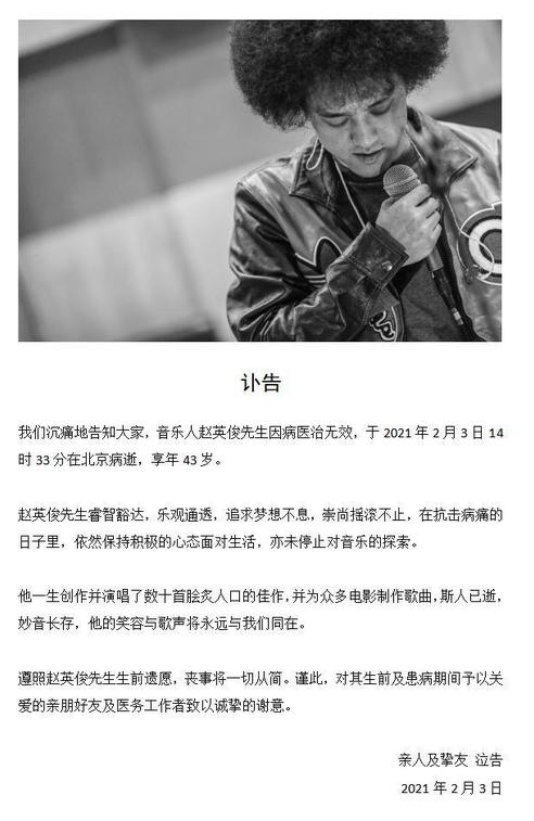 2月3日,音樂人趙英俊親友發(fā)布訃告,稱趙英俊因病醫(yī)治無效,于2021年2月3日14時33分在北京去世,終年43歲。趙英俊曾為《唐人街探案》《煎餅俠》《港囧》等多部電影等創(chuàng)作歌曲。得知消息后,大鵬、喬杉、韓延、張杰、包貝爾、徐崢等明星紛紛發(fā)文悼念。 >>>進(jìn)入詳文