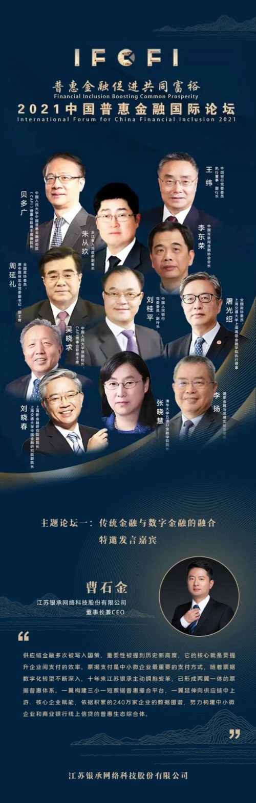 本屆IFCFI嘉賓咖位超高,內(nèi)容豐富:從一行兩會(huì)的領(lǐng)導(dǎo),到踏實(shí)努力踐行普惠金融使命的大中小型銀行、科技金融機(jī)構(gòu)的代表,以及學(xué)術(shù)界的重量級(jí)嘉賓,都在2021IFCFI上貢獻(xiàn)真知灼見。論壇采用線上+線下同步進(jìn)行的形式,云集百位行業(yè)大咖,探討話題意義深遠(yuǎn),受到了社會(huì)各界的廣泛關(guān)注。江蘇銀承網(wǎng)絡(luò)科技股份有限公司(以下簡(jiǎn)稱:江蘇銀承)作為供應(yīng)鏈末端中小微企業(yè)三小一短供應(yīng)鏈票據(jù)平臺(tái)領(lǐng)軍者,其董事長(zhǎng)兼CEO曹石金受邀出席本次論壇,并發(fā)表演講。