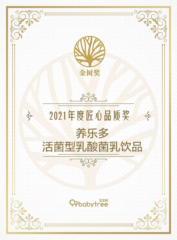 2021年12月2日,被譽為“母嬰界奧斯卡”的第七屆金樹獎年度榜單正式揭曉,養(yǎng)樂多(中國)投資有限公司憑借卓越的“產(chǎn)品力”、“品質(zhì)力”、“社會責(zé)任力”榮獲“2021年度匠心品質(zhì)獎”。