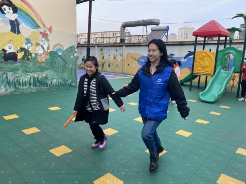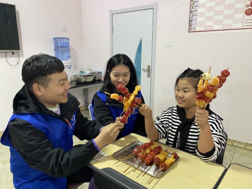 時至年末,志愿者們再一次看望孩子們,混在人群中的小王一眼被媛媛識別出來。利用半天時間,志愿者們與孩子們一起制作冰糖葫蘆、玩益智小游戲、接力賽跑。在制作冰糖葫蘆過程中,小王拿著竹簽聲情并茂地引導(dǎo)媛媛,“媛媛,這里有山楂和橘子,你喜歡吃哪個呢?”她看了看,拿起了山楂?!叭绻阆矚g吃冰糖葫蘆,那就把山楂串在王姨的竹簽上,再將橘子也串在一起”,她竟然都做到了。做好的山楂,還會試著往小王的嘴里塞,激動興奮的小王一把抱住了媛媛,現(xiàn)場響起了喜悅的掌聲。