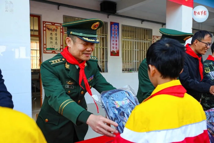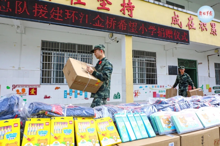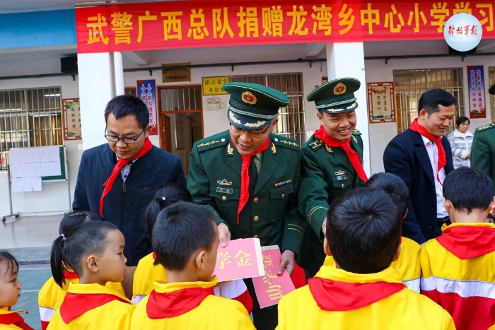 在都安龍灣鄉(xiāng)中心小學(xué),武警官兵為學(xué)生發(fā)放學(xué)習(xí)用品?! ?/p>