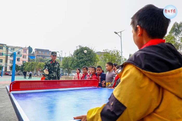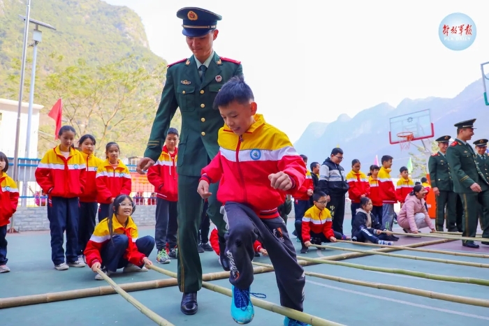 在都安龍灣鄉(xiāng)中心小學(xué),武警官兵為學(xué)生們表演軍事科目。