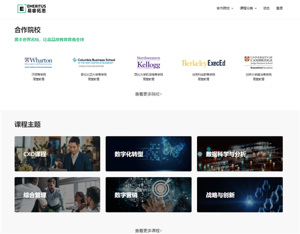 截至目前,Emeritus與麻省理工學院、哥倫比亞大學、哈佛大學、劍橋大學、歐洲工商管理學院、沃頓商學院、加州大學伯克利分校等 50多所大學展開了合作。Emeritus于 2019年進入中國,希望培養(yǎng)領(lǐng)軍人才賦能企業(yè),服務(wù)于中國經(jīng)濟的數(shù)字化轉(zhuǎn)型。Emeritus中國的主體為上海擇藤教育科技有限公司,易睿拓思是其在中國的注冊商標。