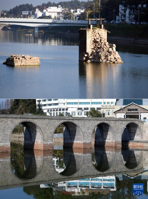 這是一張拼版照片。上圖:2020年11月12日拍攝的被沖毀后遺留的鎮(zhèn)海橋橋墩(新華社記者周牧攝);下圖:12月21日拍攝的完成修繕后的鎮(zhèn)海橋(新華社記者劉軍喜攝)。