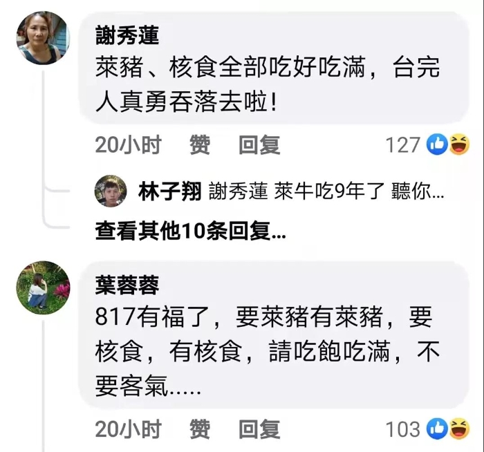 更有臺(tái)灣民眾諷刺“817有福了,要萊豬有萊豬,要核食有核食,請(qǐng)吃飽吃滿,不要客氣……”