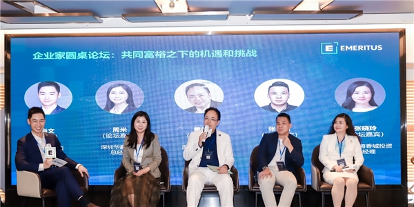 在圓桌論壇環(huán)節(jié),Emeritus中國CEO熊尚文邀請校友代表深圳華勤創(chuàng)展總經(jīng)理周米女士,深圳虹云供應(yīng)鏈董事黃俊威先生,創(chuàng)意國際傳媒CEO 張鈞瑜先生和深圳前海香城投資總經(jīng)理張曉玲女士針對《共同富裕之下的機(jī)遇和挑戰(zhàn)》,從企業(yè)家角度如何掌舵展開探討。