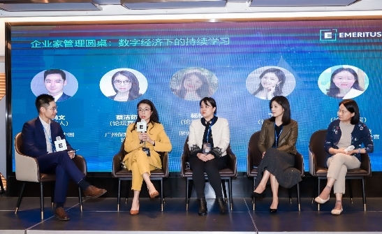 在企業(yè)家管理圓桌中,Emeritus中國CEO熊尚文以《數(shù)字經(jīng)濟(jì)下的持續(xù)學(xué)習(xí)》為題,與廣州保利電商港監(jiān)事蔡潔茹女士,深圳俊協(xié)文化有限公司總經(jīng)理?xiàng)盍?,勁葛琳克托育總?jīng)理丁芊女士和思欣躍教育科技總經(jīng)理,首席醫(yī)務(wù)官蔣忠梅女士四位校友代表,分享作為企業(yè)家如何保持學(xué)習(xí)以及數(shù)字化在各自行業(yè)的應(yīng)用。