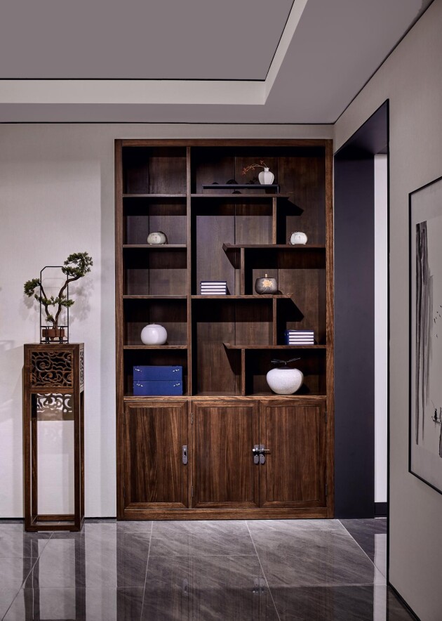 博古之意即為“通曉古事古物”,在典雅莊重、精致奇妙的中式家具系列里,博古架屬于中式設(shè)計(jì)書(shū)房,客廳中可陳設(shè)古玩瓷器等珍寶的一類家具,既有實(shí)用功能,又突顯中式空間的裝飾美學(xué)。書(shū)檀設(shè)計(jì)師在深入理解宋式家具的造型、裝飾、意境的人文內(nèi)涵基礎(chǔ)之上,融合現(xiàn)代極簡(jiǎn)設(shè)計(jì)風(fēng)格,既具中國(guó)傳統(tǒng)家具的意境,又不失時(shí)尚感。曲直之間,盡顯中式文化的韻律。