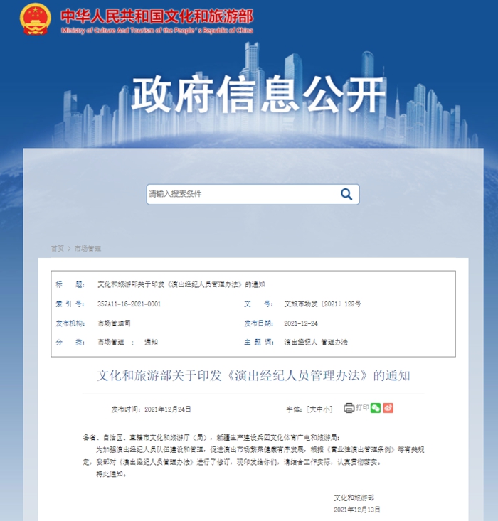 文化和旅游部關(guān)于印發(fā)《演出經(jīng)紀人員管理辦法》的通知