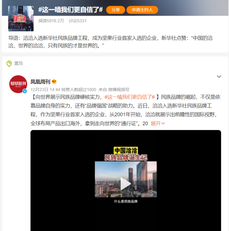 同時,鳳凰周刊、封面新聞等官媒也在微博點贊洽洽:“20年來‘揚帆出?!那⑶⒁殉蔀閭鬟f中國品牌的名片之一”,“洽洽20多年‘只為一把好堅果’的初心,也展示了不一樣的中國品牌力量”,鏗鏘有力的話語,對洽洽入選新華社民族品牌工程的高度認(rèn)可,引發(fā)無數(shù)網(wǎng)友熱議,微博話題#這一嗑我們更自信了#閱讀量更是飆升至5916w。