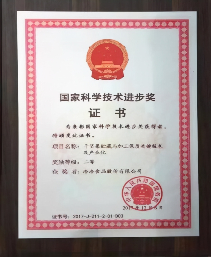 洽洽還憑借關(guān)鍵技術(shù)和創(chuàng)新活力,在全產(chǎn)業(yè)鏈取得230項專利,其中,洽洽所掌握的“干堅果儲藏及加工保質(zhì)關(guān)鍵技術(shù)”,獲得了國務(wù)院頒發(fā)的“國家科學(xué)技術(shù)進(jìn)步獎”二等獎。