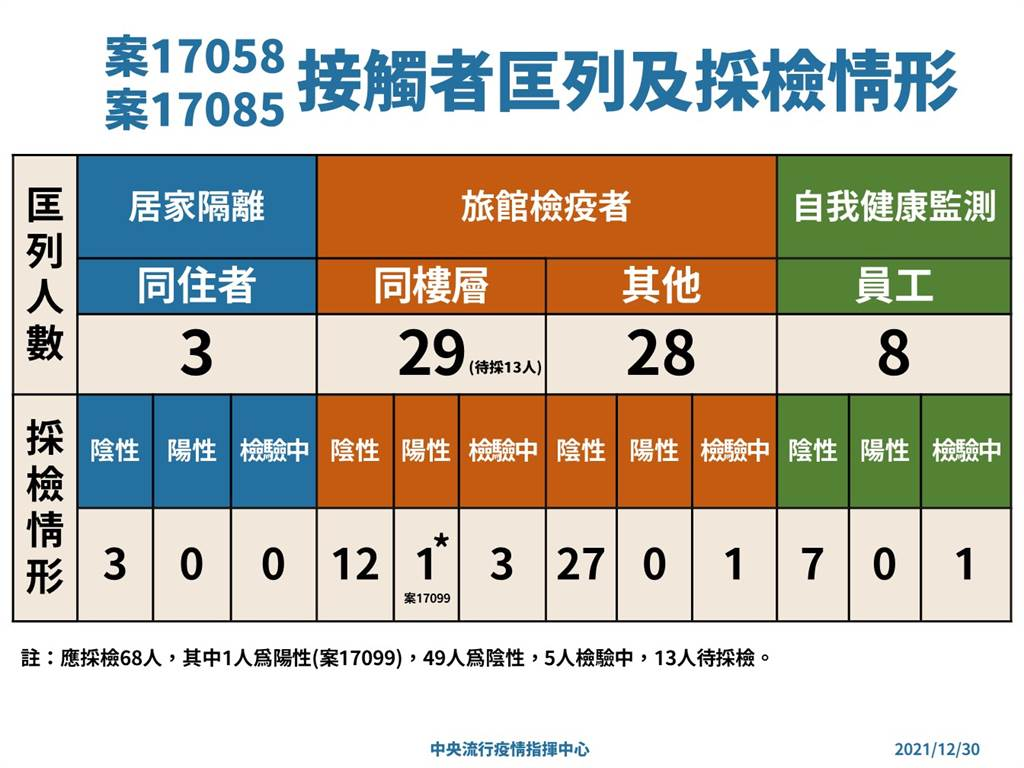 臺北巿防疫旅館爆3人同時(shí)確診,相關(guān)接觸者采檢情形。(圖/指揮中心提供)