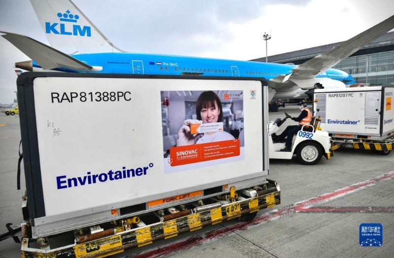 2021年10月14日,工作人員在柬埔寨金邊國際機場運輸中國政府援助柬埔寨的科興新冠疫苗。新華社發(fā)(批隆 攝)