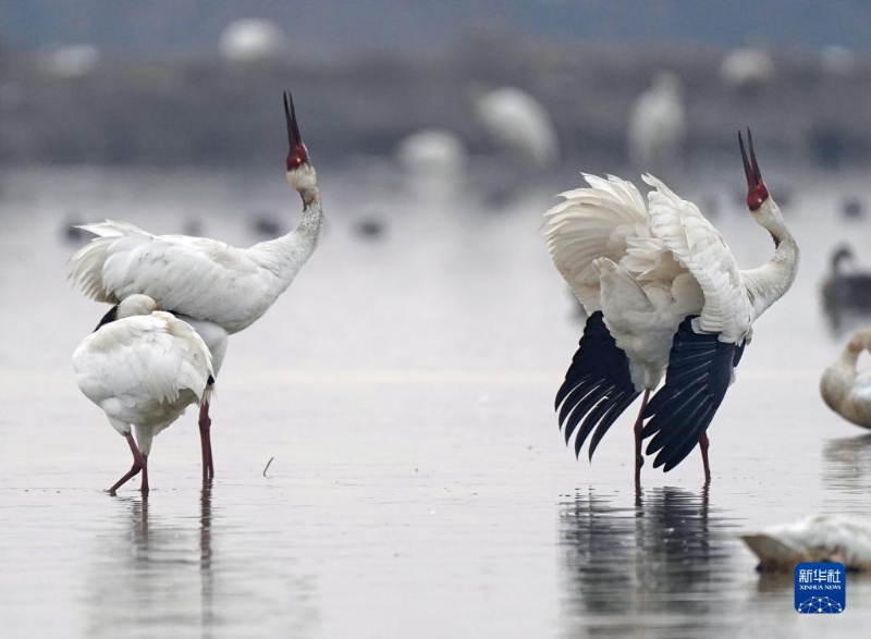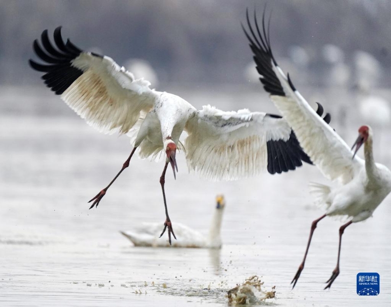 白鶴在濕地追逐嬉戲(1月1日攝)。新華社記者 萬象 攝