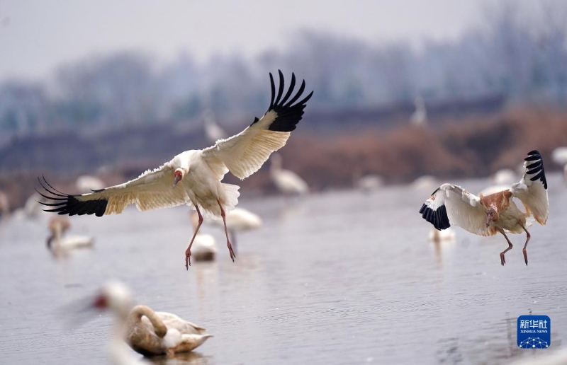 白鶴在濕地飛舞(1月1日攝)。新華社記者 萬象 攝