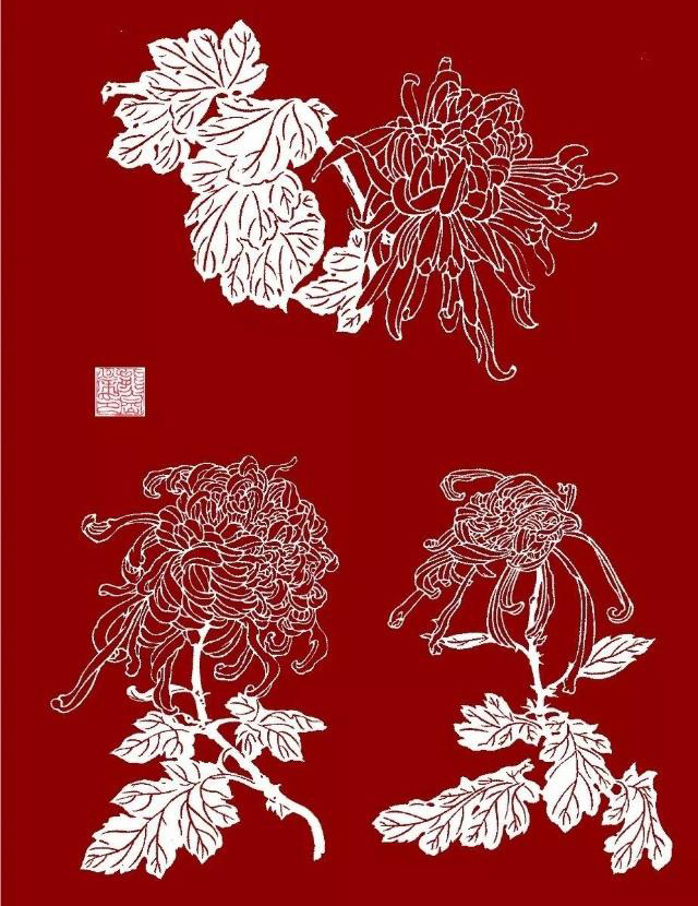 揚(yáng)州剪紙從刺繡花樣發(fā)展到現(xiàn)在的藝術(shù)型剪紙,其表現(xiàn)手法和中國面白描的手法有異曲同工之妙。白描是以線為表現(xiàn)手段,依靠線本身的變化來表現(xiàn)各種物象。而揚(yáng)州剪紙整幅作品就是由線條組成,可以說是用剪刀代替毛筆,剪出流暢的線條。如中國工藝美術(shù)大師張永壽先生的代表作《百菊圖》中的“羅漢須”,線條彎轉(zhuǎn)流暢,卷曲自如,每片花瓣就是一根彎轉(zhuǎn)流暢的線條,線線連接,上密下疏,卷曲的線條蒼勁有力,整個(gè)花頭飽滿整體。如果除去工具和表現(xiàn)手法的話,可以說,揚(yáng)州剪紙就是我們剪出來的中國白描。