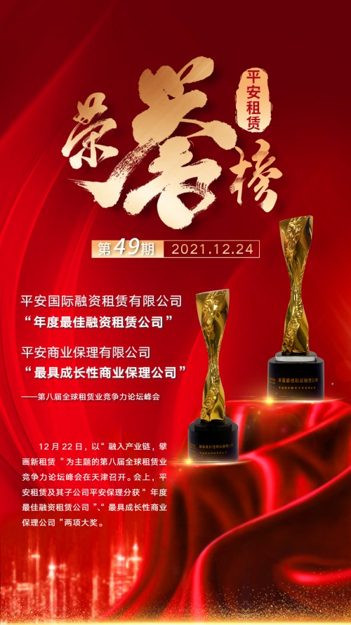 近日,第八屆全球租賃業(yè)競爭力論壇峰會在天津召開。本次峰會以“融入產(chǎn)業(yè)鏈,擘畫新租賃”為主題,探索租賃業(yè)可持續(xù)發(fā)展道路,以理性、建設性態(tài)度促進融資租賃業(yè)健康發(fā)展。平安國際融資租賃有限公司(下稱“平安租賃”)受邀參會,并獲得“年度最佳融資租賃公司”榮譽。同時,平安租賃子公司平安商業(yè)保理有限公司(下稱“平安保理”)獲得“最具成長性商業(yè)保理公司”獎項。