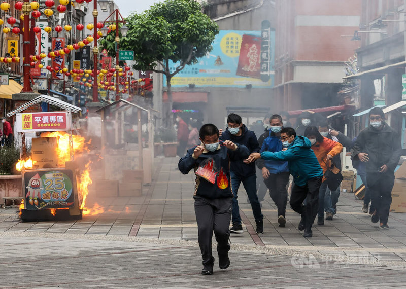 臺(tái)北年貨大街15日登場,臺(tái)北市消防局今天在迪化年貨大街舉辦消防演習(xí)活動(dòng),盼可強(qiáng)化迪化街及永樂市場攤商、店家防災(zāi)觀念與應(yīng)變能力,確保民眾年關(guān)采購安全。